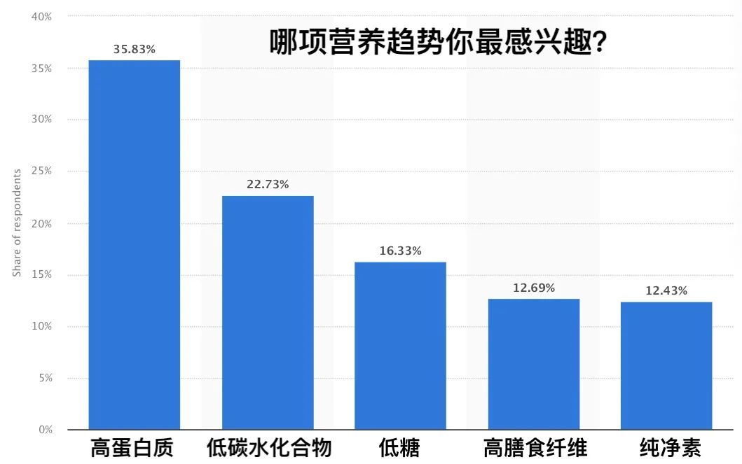 高蛋白质膳食是现在最流行的膳食趋势,大家普遍认为“高蛋白”意味着“更健康”。一项来自网络的调查显示2019年中国消费者最感兴趣的膳食趋势正是高蛋白质膳食。