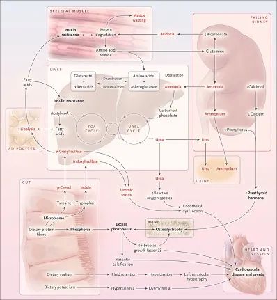 肾脏在蛋白质的排泄中起到了重要作用,虽然蛋白质代谢产生的氨主要是在肝脏中被分解成为中性无毒的尿素,但是大部分尿素最终都要通过肾脏排出体外。在排泄代谢废物的过程中,肠道、肝脏以及身体其他器官和肾脏有着复杂的交互作用。