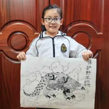 《保护野生动物》—戚晓韵创作灵感:如今,越来越多的人提到“保护野生动物园”。动物是我们人类的好朋友,为了维护生态平衡,保护物种延续,作为地球村的一员,我们要齐心协力共创美好家园。大家都知道,“穿山甲”、“东北虎”、“大熊猫”、“丹顶鹤”、“藏羚羊”都是我国一级保护动物,我把它们巧妙地融合在一幅作品里。为了凸现保护野生动物是一件严肃、紧迫又刻不容缓的大事,我选择运用了对比鲜明且线条感更强的线描方式。“穿山甲”脚下的“祥云”,预示着这些野生动物会在我们的共同努力下,平安祥瑞地生活。