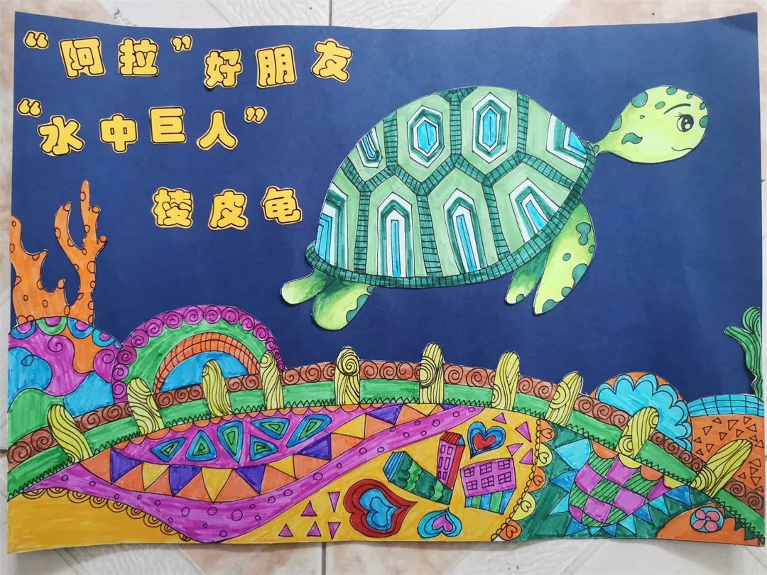 《阿拉“好朋友”棱皮龟》—陆允楠创作灵感:棱皮龟种群数量呈锐减趋势,其中一个重要原因是,由于人们在海水中丢弃废塑料袋使棱皮龟误认为是水母而误食,造成肠道阻塞而死亡;加上过度捕捉和溺毙,所以数量日益减少。眼看着这种珍贵的动物濒临灭绝,而无能为力,实在令人心痛。希望通过画作可以唤醒人们保护珍惜动物的意识,动物永远是我们的“好朋友”!