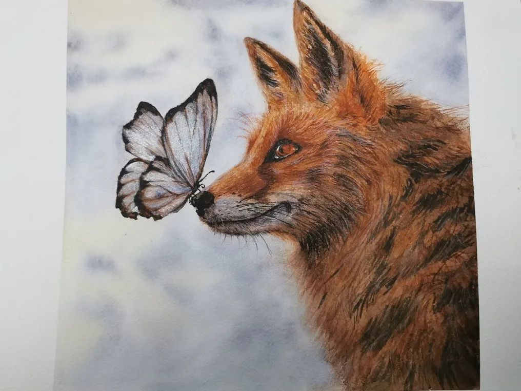 《鼻尖上的舞蹈》—江馨绮创作灵感:本次去动物园,参观了很多有趣的动物,其中给我印象最深的就是一群蝴蝶飞舞在花草间,我联想着如果狐狸此时正在悠闲地漫步的话,它们相遇了,于是蝴蝶围着狐狸身边翩翩起舞,美丽而和谐,这给我带来了灵感。与此同时我也感慨如果大家能爱护环境,保护生态平衡,保护野生动物,那么我们人与动物是不是就可以更加和谐的生活在一起了呢?而不是只有在动物园才能看到它们的身影。希望我们大家一起自觉保护环境,创造美好的未来!