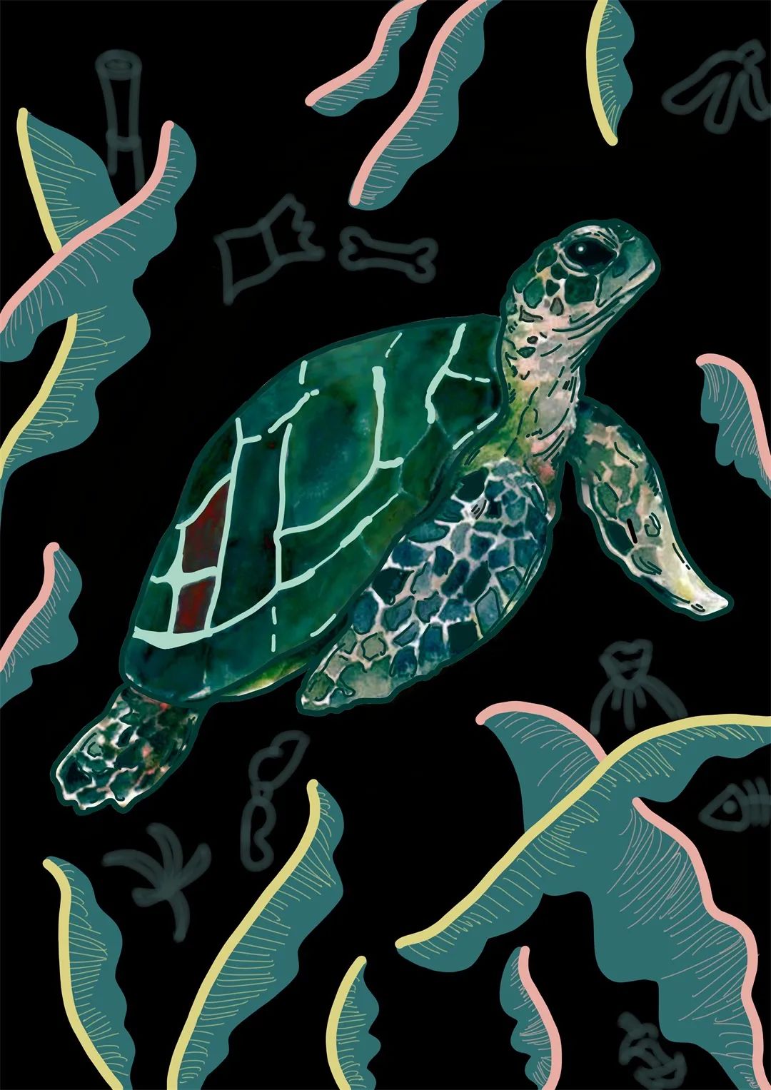 《地球上最后的生物》—徐钰斐创作灵感:当下海洋环境问题日益严重,越来越多的人开始关注水环境和水生物保护。人类污染海洋就是作茧自缚,我们应该与海洋和谐共生,积极号召保护海洋生物。本次设计采用3幅图为一系列表现,大海中的鲸鱼、海狮和海龟为主要形象,添加了海洋中的波纹、植物等肌理和纹路,深色背景衬托主体物。在可爱的海洋生物面前,周围的垃圾形成一道道困扰伤害它们的枷锁,引人深思,提醒大众保护海洋环境。构思新颖,色彩协调,让人眼前一亮。