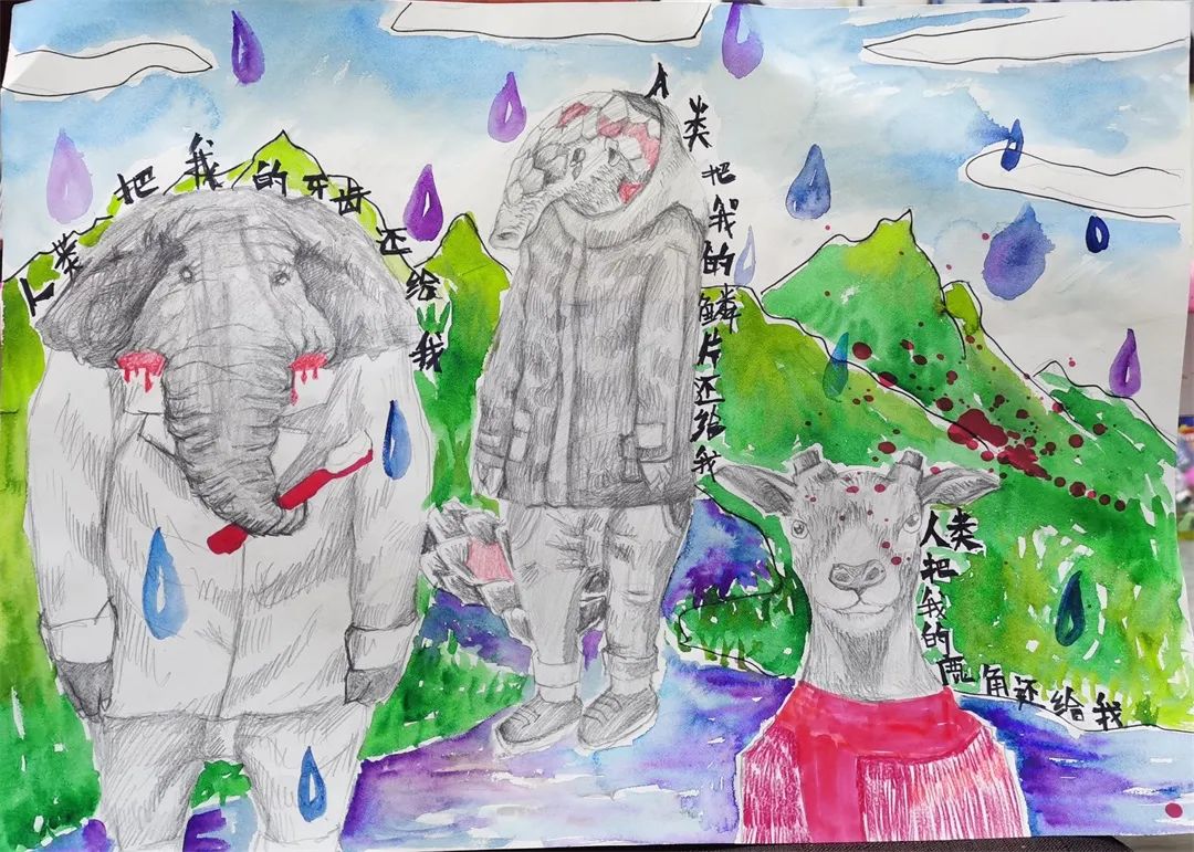 《动物的呐喊》—戚梓晴创作灵感:一个闲暇的午后,无意中看到电视中正在播放关于动物的世界,节目中正在介绍如今地球上野生动物的现状与情况,听着主持人的讲述和非洲野生动物不可思议的被猎杀,看到那些受害动物们无辜的眼神经历着寒冬,濒临灭绝的野生动物。