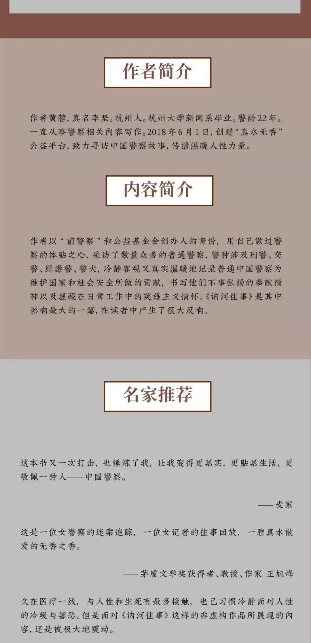 黄蓉真名李坚。杭州人。杭州大学中文系毕业。警龄22年。一直从事警察相关内容写作。2018年6月1日,创建“真水无香”公益平台,致力寻访中国警察故事,传播温暖人性力量。