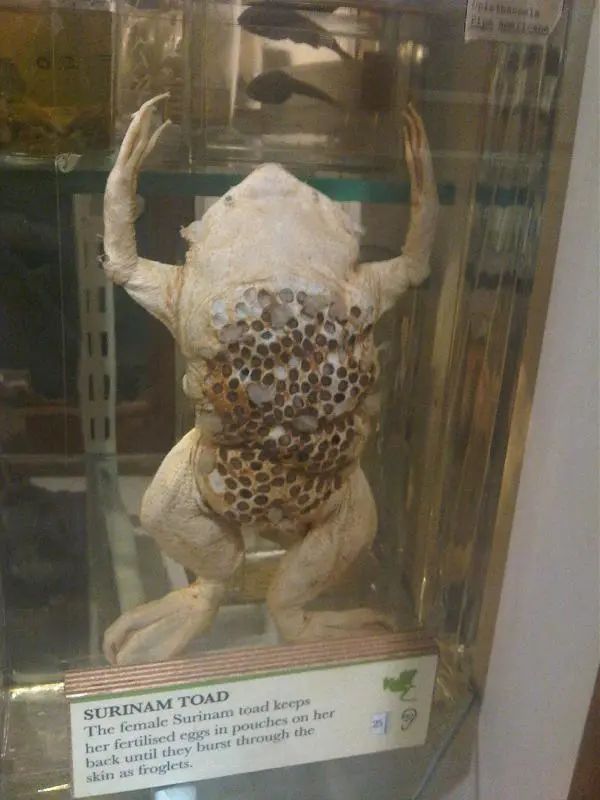 生娃时,幼蟾们开始在妈妈后背的小孔里扭啊扭,最后“嘣”地从妈妈的后背喷射而出,开始自己的新生活。在很短的时间里,从妈妈后背蹦出的幼蟾可以多达100只……生完孩子,雌性也慢慢地褪去后背那层孕育过小生命的皮肤。