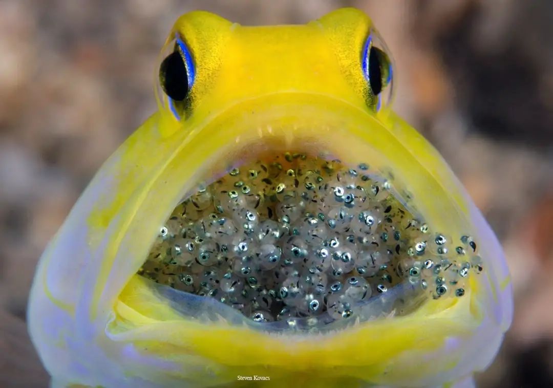 一只雄性黄头后颌鱼 | Steven Kovacs和其它鱼类的繁殖相比,口腔能够容纳的小鱼儿虽然有限,但是这些后代的成活率更有保障。水里危机四伏,大鱼一旦感觉到周围有威胁,就会立刻撤到洞穴中躲起来。大鱼还可以随时照顾小鱼,为了让小鱼透透气、清理嘴里的脏动物、以及死胎,大鱼隔一段时间就得把小鱼都吐出来,然后再迅速把它们吸回嘴里。