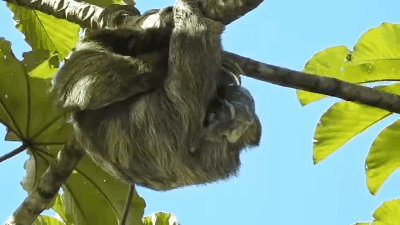 树懒行踪隐秘,分娩的场景很少被人看到。上图中的树懒宝宝出生时突然掉落,还好有脐带吊着,最后安全回到妈妈的怀里 | Steven Vela