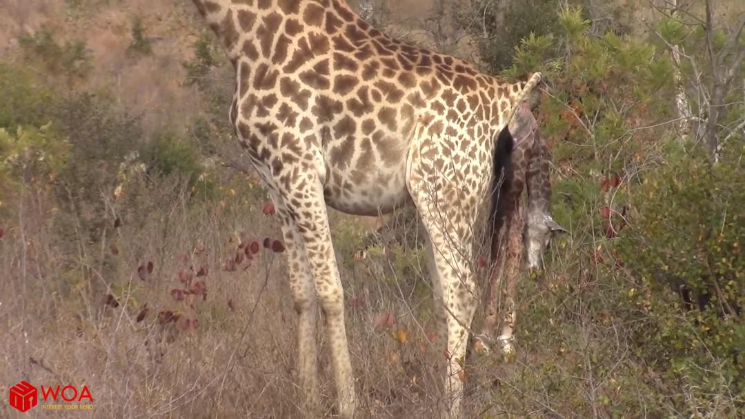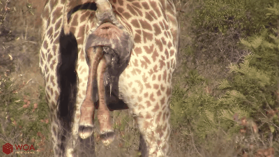 WOAanimals陆地上最高的哺乳动物长颈鹿站着分娩,长颈鹿宝宝像是要爬出来,前腿和脑袋先出来,出来后小宝宝将从妈妈两米高的屁股往下掉落——这能让羊膜囊破裂,帮助长颈鹿宝宝呼吸。孩子长大后,会去妈妈原来生娃的地方生娃。