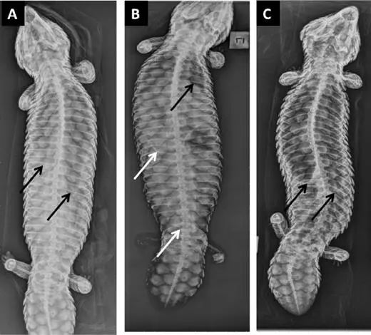 因为胎儿太大了,蜥蜴妈妈的肺部受到明显挤压。图A是产前40天,图B为产前3天,图C为产后两天。