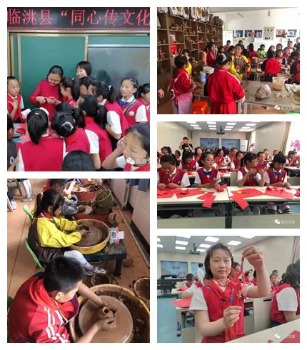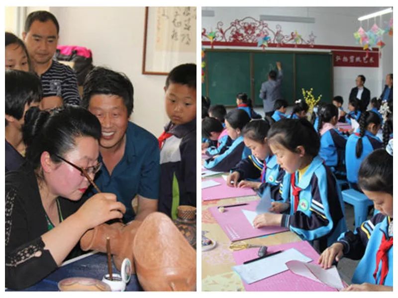 临洮县西街小学邀请剪纸传承人毛艳红和陶器制作技艺传承人阎建林老先生向孩子们介绍临洮剪纸和陶器制作技艺的发展历史、技艺要领等方面知识,并进行现场教学。