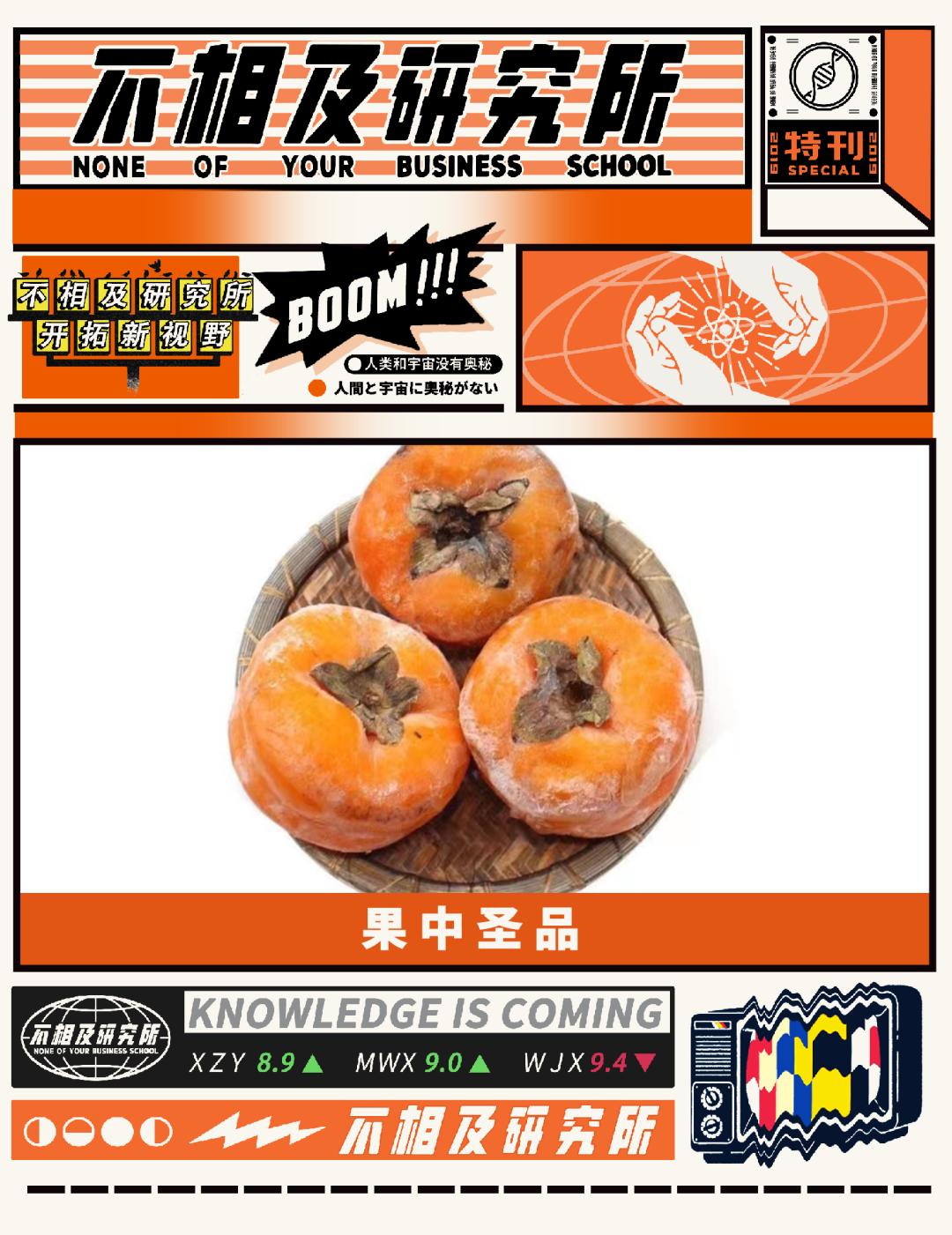 相比于冻梨的阴郁气质,冻柿子总是显得更鲜活一点,一直有人认为它主动封存了自己的善意,又将其温柔地展现给了人类的味觉系统。有人说自己买了一箱冰棍,还是没法割舍那个椭圆形的蜜罐子,也有人说自己已经深入它的语境中,给董事长发消息都打错打成了冻柿子,直到一分钟后才反应过来。