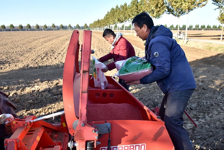2021年10月26日,河北邢台市南和区阎里乡农民在田间为播种机添加冬小麦种子。图|新华社