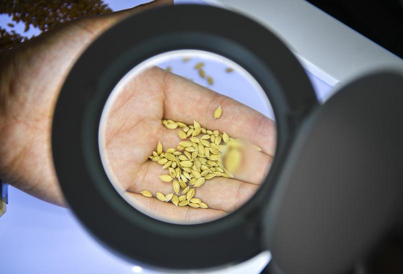 2020年8月12日,吉林市永吉县一拉溪镇九月丰家庭农场,工作人员在实验室中检测一批试种水稻的稻谷外观。图|新华社