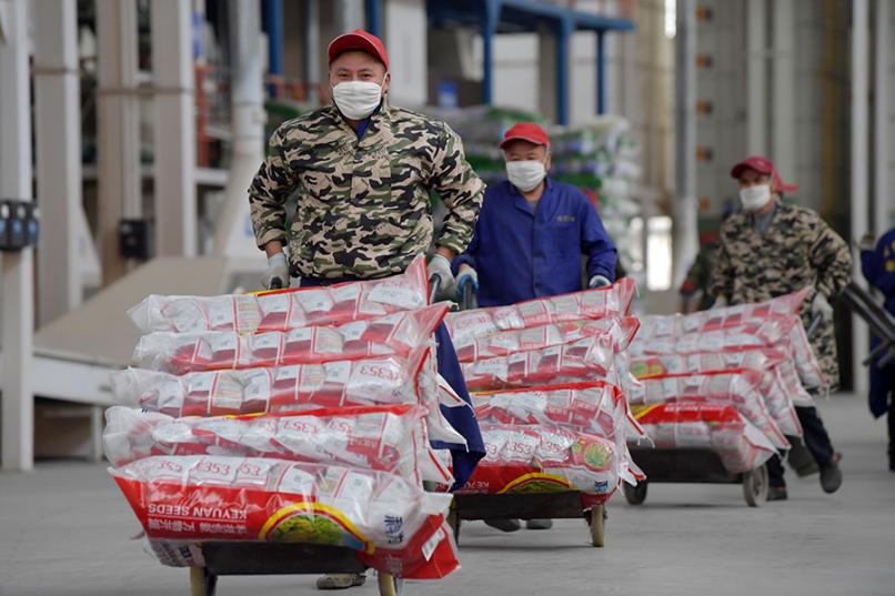 2021年3月10日,江西南昌县一家种业公司车间内,工人在搬运即将销售的种子,以备春耕春播。图|新华社