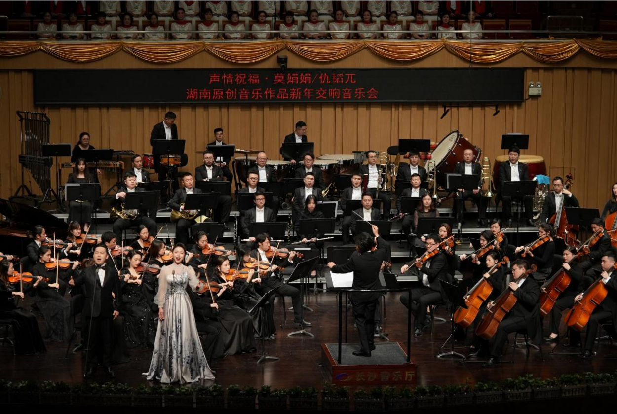 2022年1月11日晚,由湖南省歌舞剧院、长沙淡趣文化传媒有限公司主办,长沙交响乐团承办,长沙音乐厅协办的“声情祝福•莫娟娟/仇韬兀——湖南原创音乐作品新年交响音乐会”在长沙音乐厅激情上演,拉开了湖南文艺界迎新春系列活动的序幕。这是难得一见的原创音乐视听盛宴,是湖南音乐人用耕耘不辍表达对潇湘热土的热爱和眷恋,也是湖南省歌舞剧院在乔迁新址之际主办的首场音乐会。