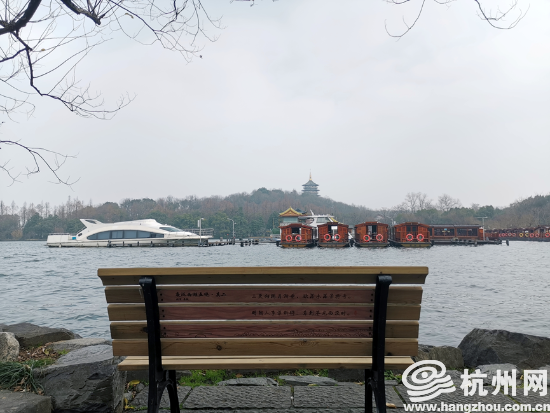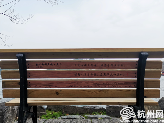 从苏堤南入口公园进入西湖,可看到新增加的芬兰木座椅,不经意间市民游客还会读到椅子背后的宋词,小小的座椅仿佛对接着时空,赏词、看景时,市民游客便不知不觉融入这宋韵的氛围。
