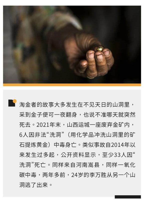 非法“洗洞”事件在国内多次发生,裁判文书网上可检索出34份相关案件判决书,加上媒体的公开报道,不完全统计已致33人死亡。不同于外界对“亡命之徒”的想象,金矿盗采者很多没读过书,抱着买房子、娶媳妇等愿望,悄无声息地走进矿洞,连日闷头干活,一心赚钱。和亲人再见面时却成了一具遗体,有的连身份证都找不到了。