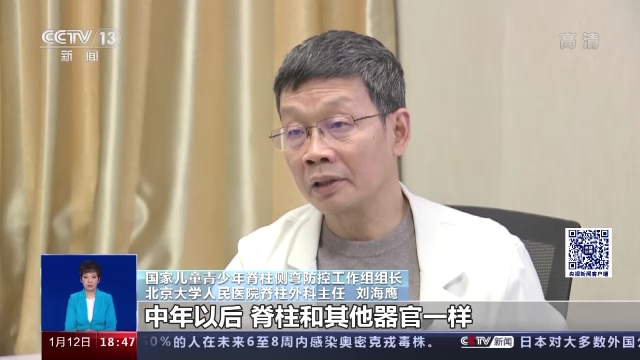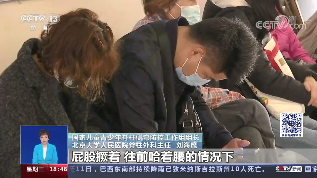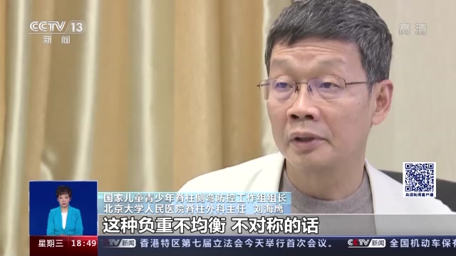 国家儿童青少年脊柱侧弯防控工作组组长、北京大学人民医院脊柱外科主任 刘海鹰:你站着叉腰或者是两边不对称的话,除了脊柱的负荷不均衡,你的髋关节,包括一侧的膝关节,这种负重不均衡、不对称的话,也会同时加速关节的一个损毁。我国已将脊柱侧弯筛查纳入学生常规体检