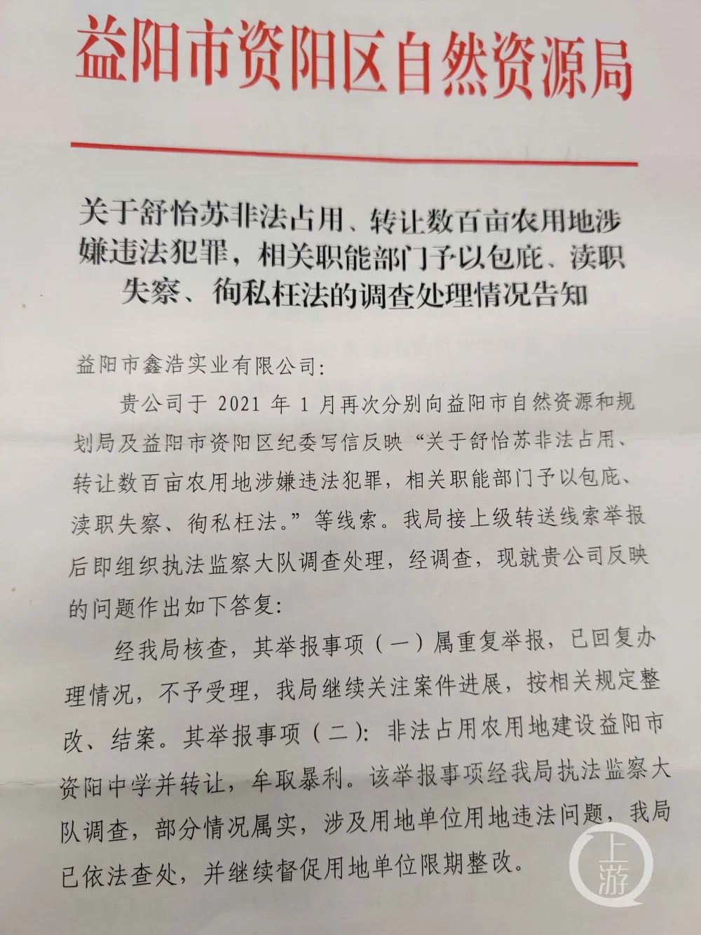 据了解,益阳市资阳区自然资源局查证卢小毛举报的内容部分属实,并于2020年10月19日对舒怡苏实际控制的益阳南丰生态示范农场有限公司(下称南丰农场)作出行政处罚,责令其退还非法占用的4582平方米土地,以及拆除地面新建建筑物和其他设施。