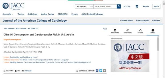 https://www.jacc.org/doi/10.1016/j.jacc.2020.02.036哈佛大学陈曾熙公共卫生学院营养系高级研究科学家、该研究的主要作者Marta Guasch-Ferré博士说:“我们的研究结果支持目前增加橄榄油和其他不饱和植物油摄入量的饮食建议。临床医生应该建议患者用橄榄油代替某些脂肪,如人造黄油,以改善他们的健康。我们的研究有助于制定更具体的建议,使患者更容易理解,并有望应用到他们的饮食中。"