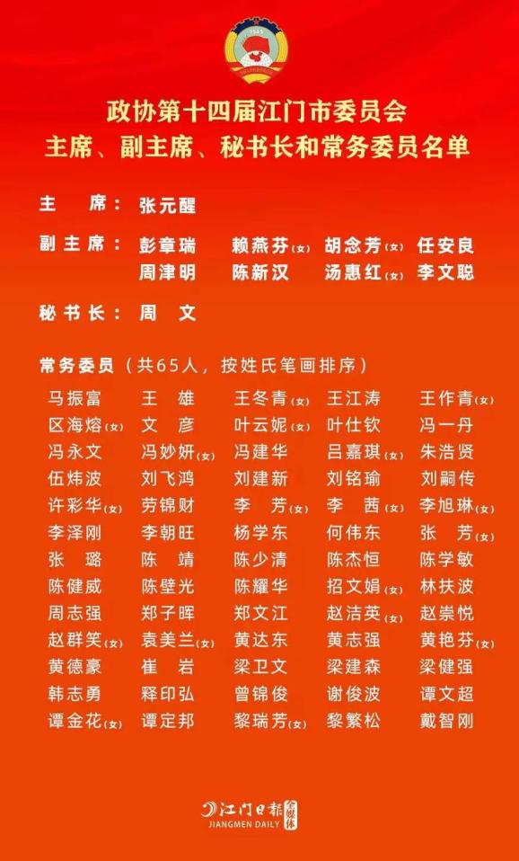 江门市第十六届人民代表大会常务委员会主任、副主任、秘书长、委员由江门市第十六届人民代表大会第一次会议于2022年1月13日依法选出: