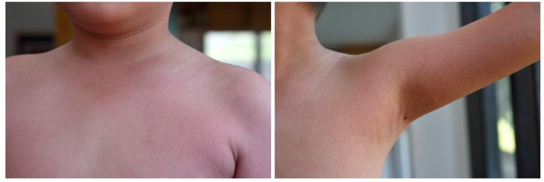 10%~15% 的宝宝发热第 4 日出皮疹,疹型表现为麻疹或者猩红热样皮疹,从躯干到四肢、从颈部到面部的离心性发疹,容易伴高热、淋巴结肿大。