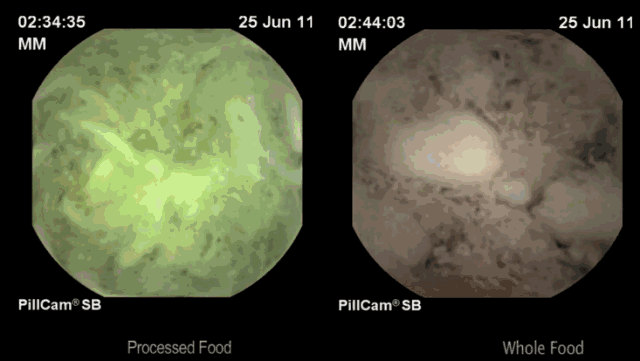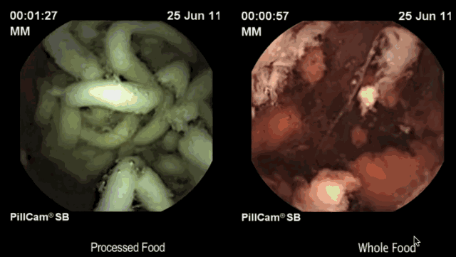 实验本身的目的,是为了观察「精加工食品」和「天然食物」在消化过程中的差别。为了证明天然食物更健康,实验本身和文案就带有一定的倾向性。