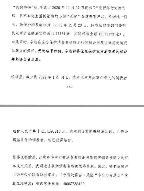 情况说明提到,“燕窝事件”后,辛选于2020年11月27日提出了“先行赔付方案”,即:召回辛选直播间销售的全部“茗挚”品牌燕窝产品、承诺退一赔三,先保护消费者权益(2020年12月23日,经市场监管部门查明认定两次直播成功交易共47474盒,实际销售金额1251.3173万元)。并依据合同及法律规定追究品牌方的责任。