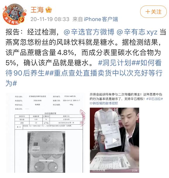 2020年11月7日,职业打假人王海在微博爆料称辛巴售卖的即食燕窝的蛋白质含量为0,并呼吁已购买的消费者尽快要求退一赔三。11月19日,王海晒出专业机构的检测报告称,辛巴所售燕窝实际上就是糖水,蔗糖含量为4.8%,成分表里碳水化合物为5%,蛋白质含量为0,确认该产品就是糖水。