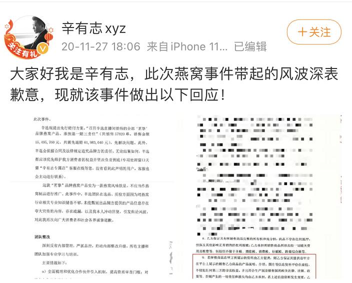 2020年11月27日,辛巴发布道歉信回应,表示确实存在夸大宣传,产品实为一款燕窝风味饮品,愿意退一赔三赔付消费者。