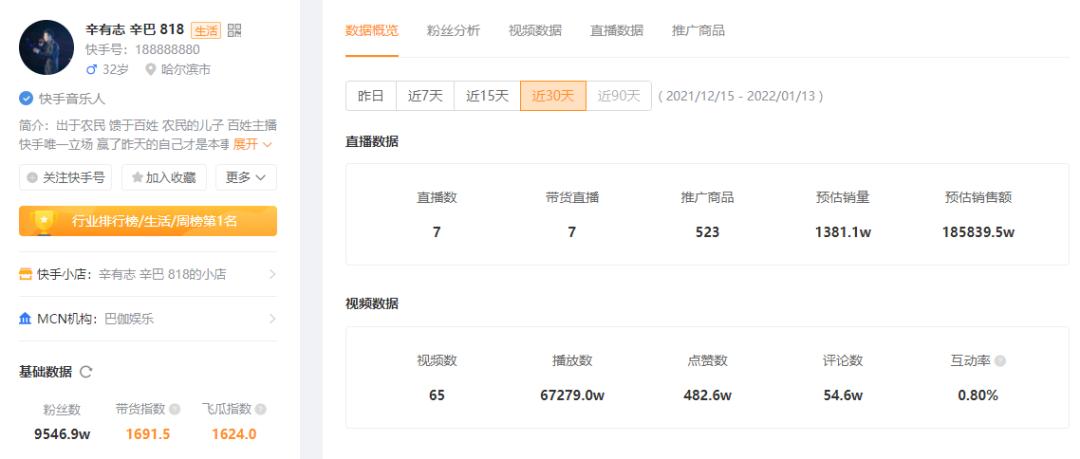 红星资本局注意到,辛巴目前依然在快手平台上活跃,粉丝数量超过9500万。飞瓜数据显示,最近30天,辛巴共进行了7场带货直播,推广产品数量为523。