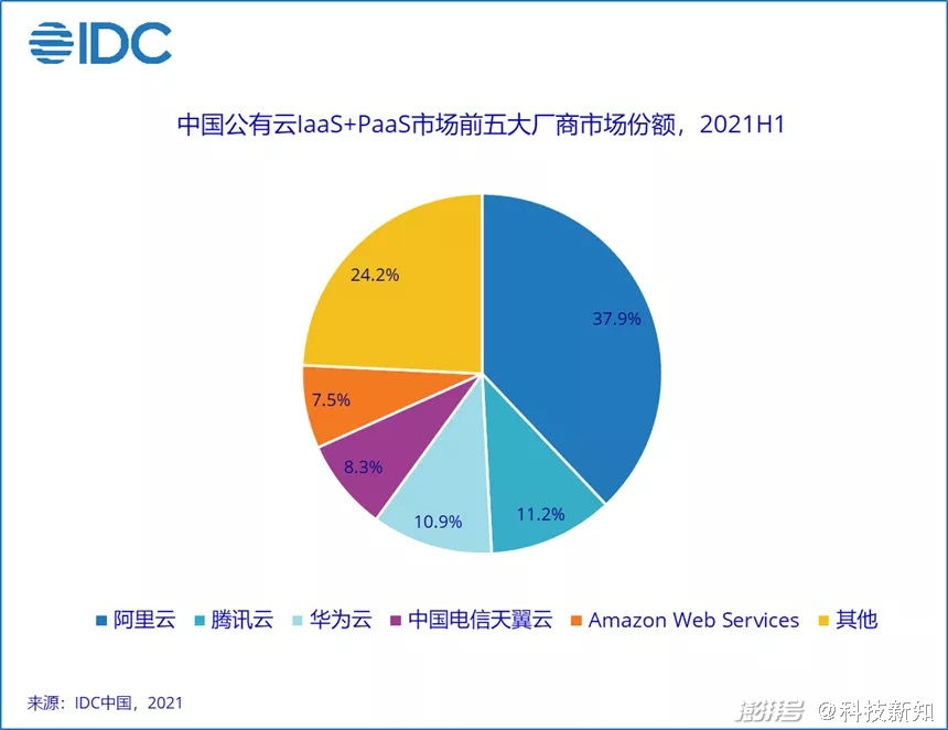 根据IDC发布的《中国公有云服务市场(2021上半年)跟踪》报告显示:2021上半年公有云IaaS+PaaS市场中,前五大厂商为阿里云、腾讯云、华为云、天翼云,亚马逊AWS。