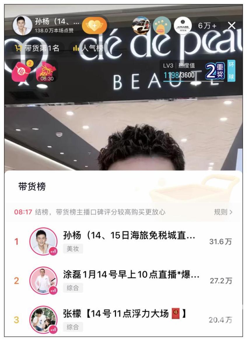 在其中午11点发布的置顶抖音短视频上,孙杨就出镜预告了“下单须知”。根据他的抖音昵称号可以发现,在海旅免税城的直播会在14日、15日进行两天。14日是孙杨在海旅免税城直播的第一天,不过他这次直播带的“货”和他的老本行关系不大,被粉丝称为阳光大男孩的孙杨,这次的直播带的货是美妆。5小时的直播中,他化身“美妆种草官”,依次在直播间销售了包括雅诗兰黛、赫莲娜、欧莱雅、娇韵诗在内的各大高端美妆产品,并涵盖水、乳、精华、眼霜、面霜、粉底液等近70个产品品类。