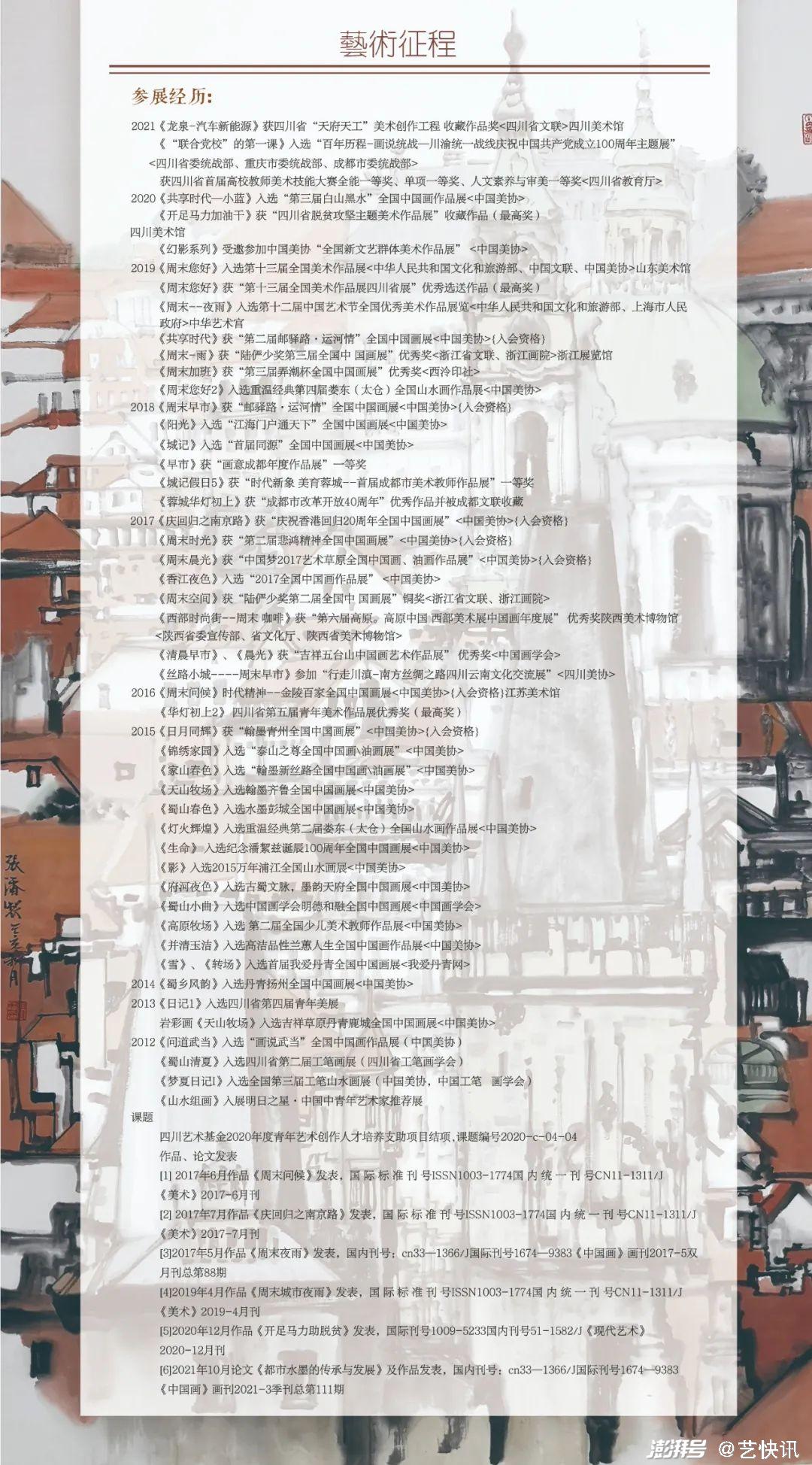 张潘;1986年生于四川成都,国家二级美术师,四川文化传媒职业学院教师,近几年有几十件作品在中国美协省美协展览中获奖。作品被江苏省美术馆、四川美术馆、香港特区政府、陕西省美术博物馆、浙江画院、高邮市博物馆等收藏,参加中国美术家协会第九次全国代表大会。参加全国性美术作品展获奖14次,入选30多次。四川省2020年青年艺术基金资助项目,2020四川省文艺百家“推优工程”艺术家。
