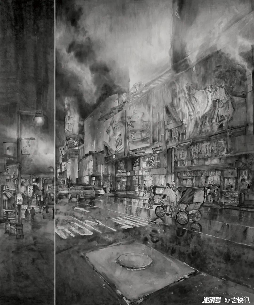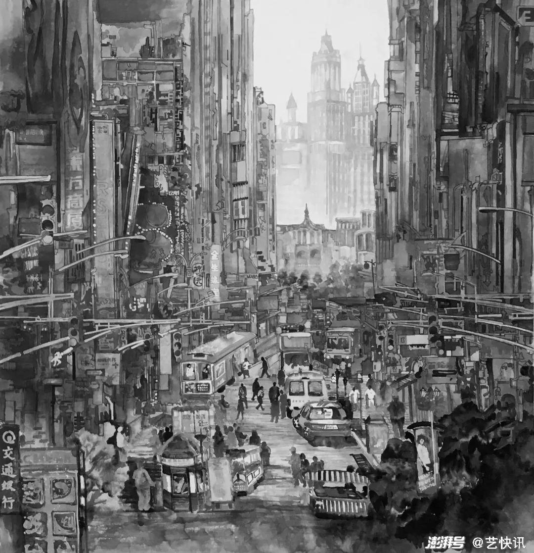 《庆回归之南京路》、《筑》为代表的尝试开始了没骨水墨的方式进行,以南京路上庆祝香港回归20周年的喜庆节日为素材,完成主题性的创作对于非人物画的画家来讲很难表现,所以在明确主题之前,我也下了很多的功夫,首先尽量的展现自己擅长的水墨,又要和前面的有所不同,于是便转向研究没骨都市水墨的创作,把传统文化精神与当代水墨精神相整合,使新水墨作品在追求文化内涵及品味的基础上,呈现出了精神化的视角张力与和谐。中国文化精神在万千变化中所显示出的至大、至正、至清的风韵,在我追求的绘画语言中不断地转化为对水墨习性的一种诉求来尽量完善她。这一系列作品整个画面基本以淡墨色笔痕进行调节,用笔也比较果断和细致,基本也是一气呵成整个画面以灰色调为主,在局部渲染和细节的调整上下了很大的力气,通过对街道建筑的探索,随着对线条质量、表现力与水墨的整合,而这种整合又不是以象征意义的图式来呈现,而是用一种黑白灰的视觉张力,柔和地引起人们思想深处的弦音,虽然低沉,但沉厚。我们只能用自己的审美趣味与经验去唤起另一种理解与感悟,而这恰恰需要的是一种纯净的心性。薄淡的笔墨之韵沉积着厚实的力量,使人们在生活的远处望见自己几乎迷失的心性。然而她就在我们生活的城市角落。