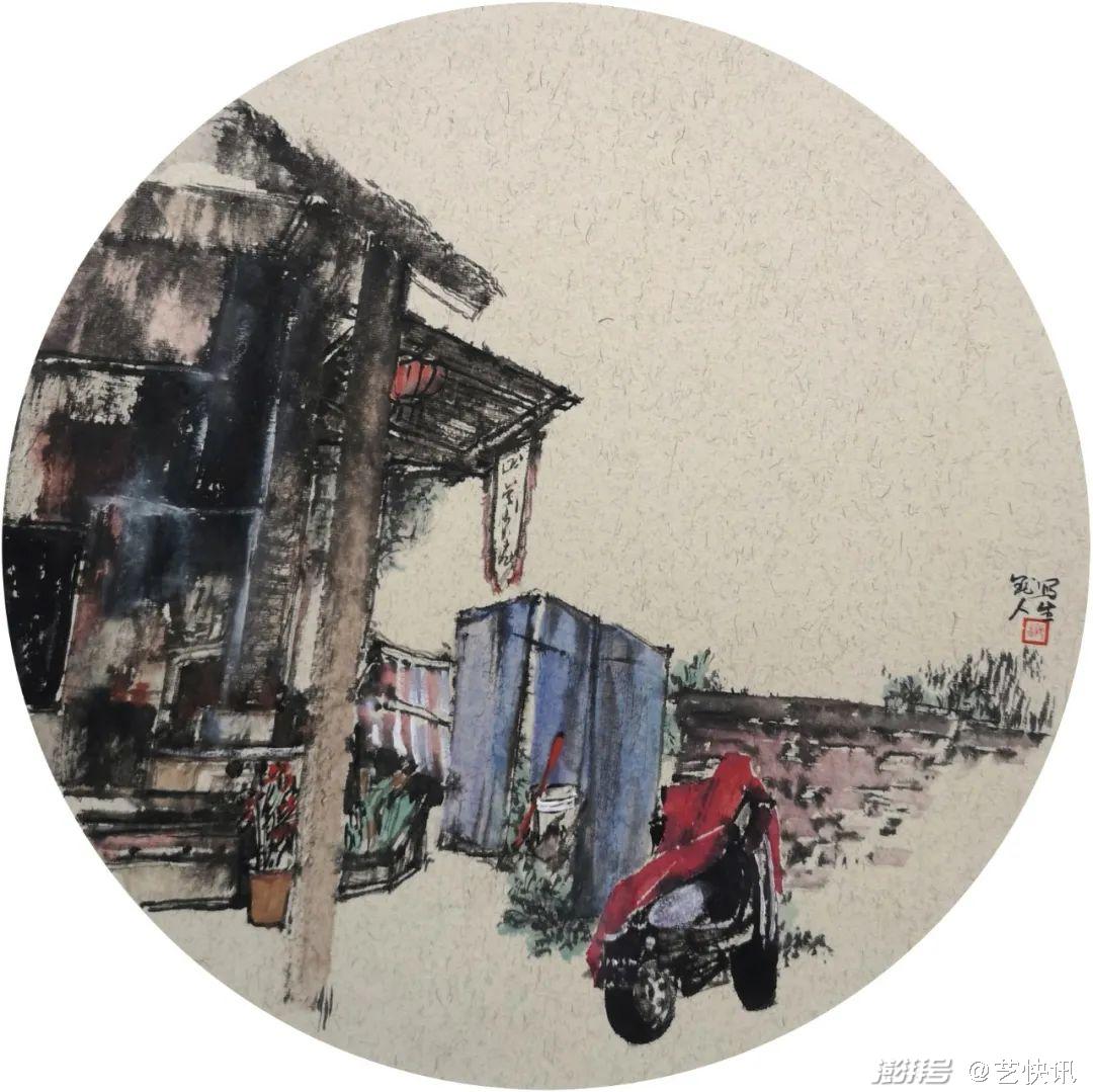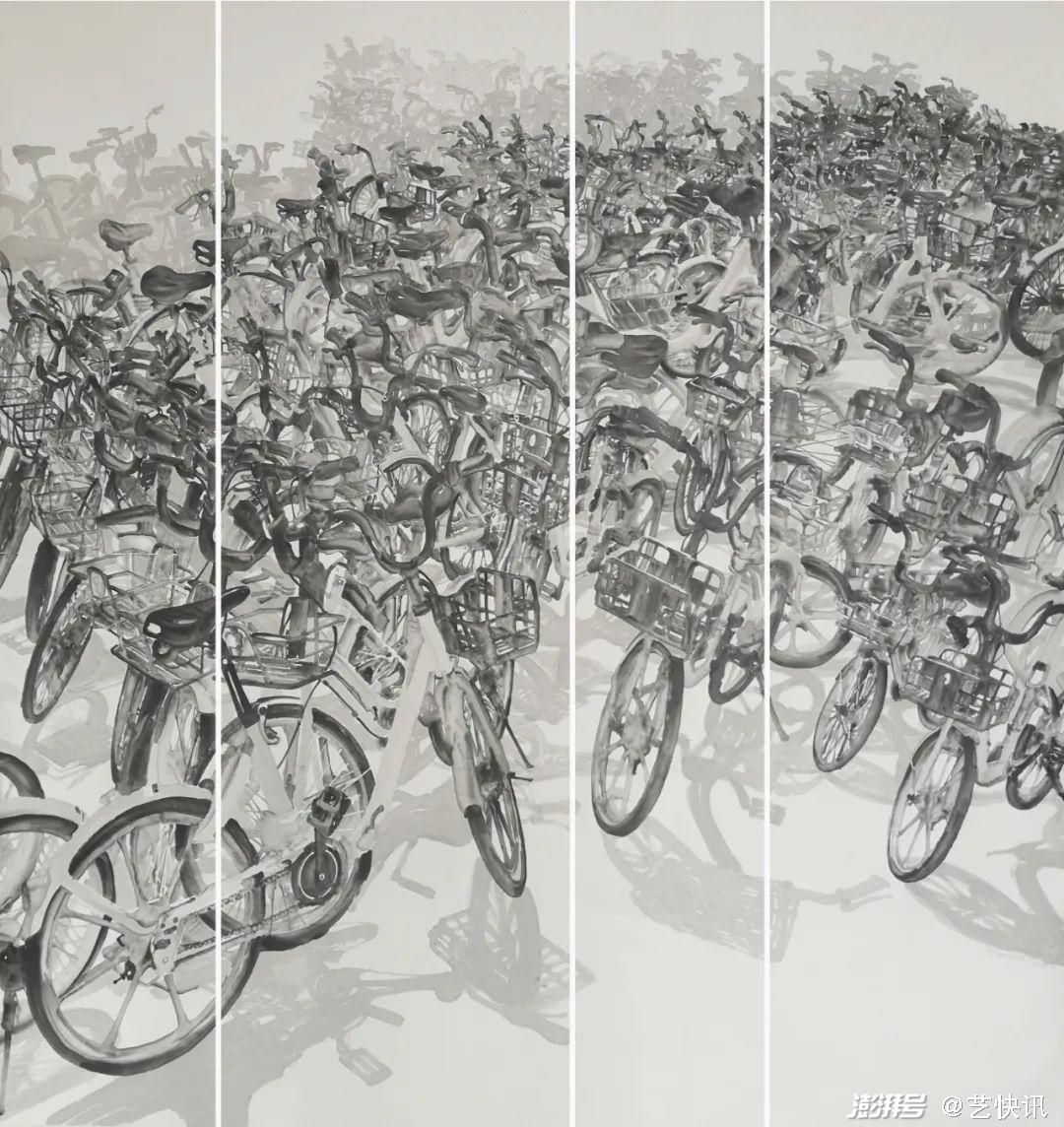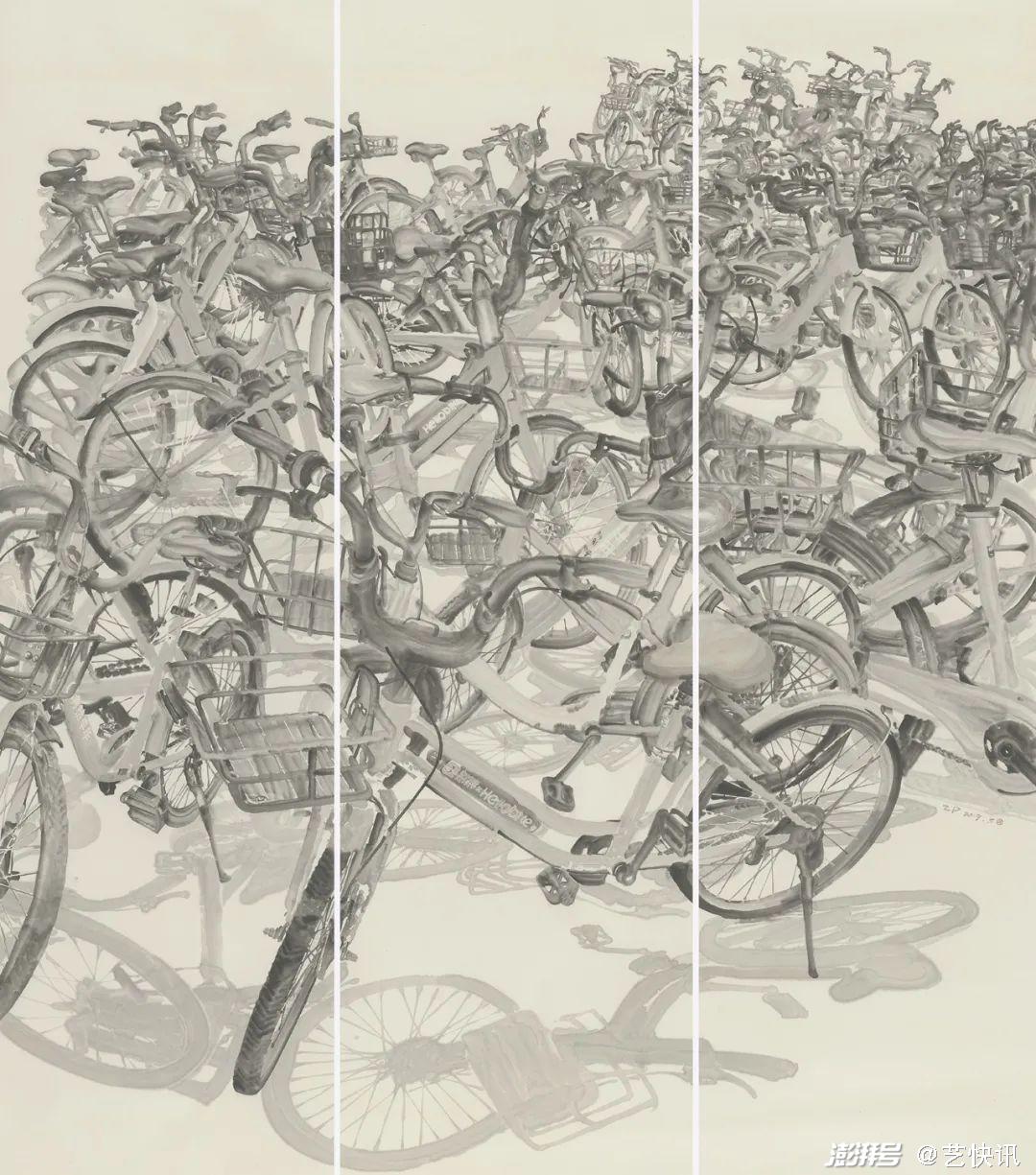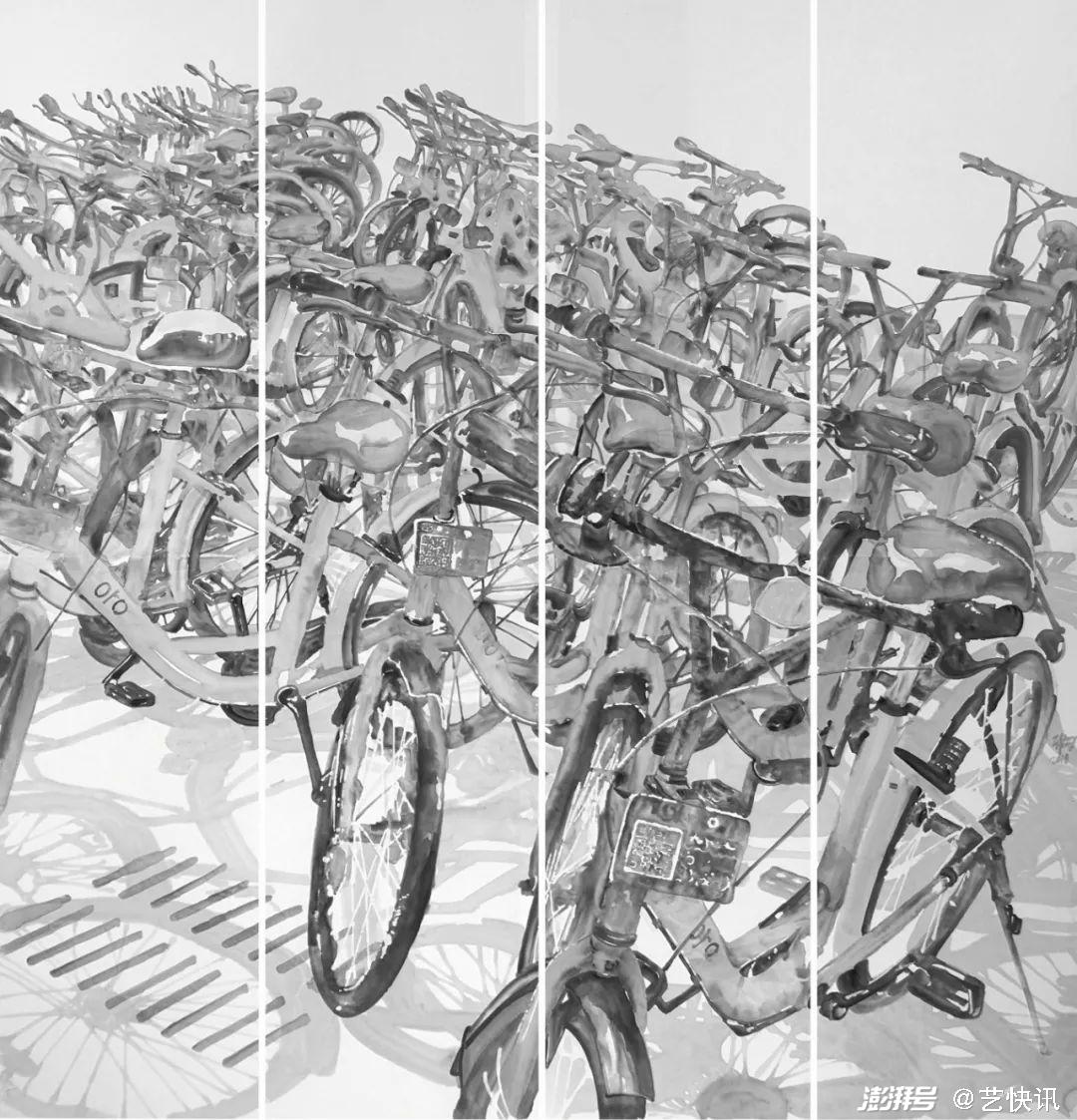 在一次偶然的机会坐地铁的时候,在地铁出站口看到了一堆共享单车,也是都市生活中与现代人密切相关的表现事物,于是便开始了《共享单车系列》的创作,在多番思考下把上一个阶段实践的没骨水墨运用到这个系列的创作中。通过擅长的水墨表现形式与手工裱板相结合,两个步骤进行创作的探索,共享系列作品从形式上开始有了自己的想法,从大作品到小品,从小品到长卷和条屏,一系列的探索,让自己有个深刻的体会。这样的三个阶段下来,笔墨语言从模糊到清晰,从生疏到生活化,慢慢的也找到了一条属于自己发展的路和笔墨形式,可能接下来会有更多的想法和表现性体裁的出现。我喜欢探索,喜欢尝试,现阶段当然都是水墨的表现手法和多样的材料相集合。江苏省美术馆,徐惠泉馆长给予画作《周末问候》的评价一样,“繁华的商业街,琳琅满目的店招,行人熙攘、车流穿梭,这样的都市图景却是以黑白灰色调的水墨画来呈现可谓别出机杼。徐惠泉认为,作者放弃了更丰富的现代绘画语言,大胆采用传统水墨画的技法来表现当代都市,形成了一种特别的审美效果,对类似风格作品的开拓创新颇有启示意义。”如果能在都市水墨语言的截取和风格的启示上,有一定的作用的话,我将不遗余力的实现更多的探索。