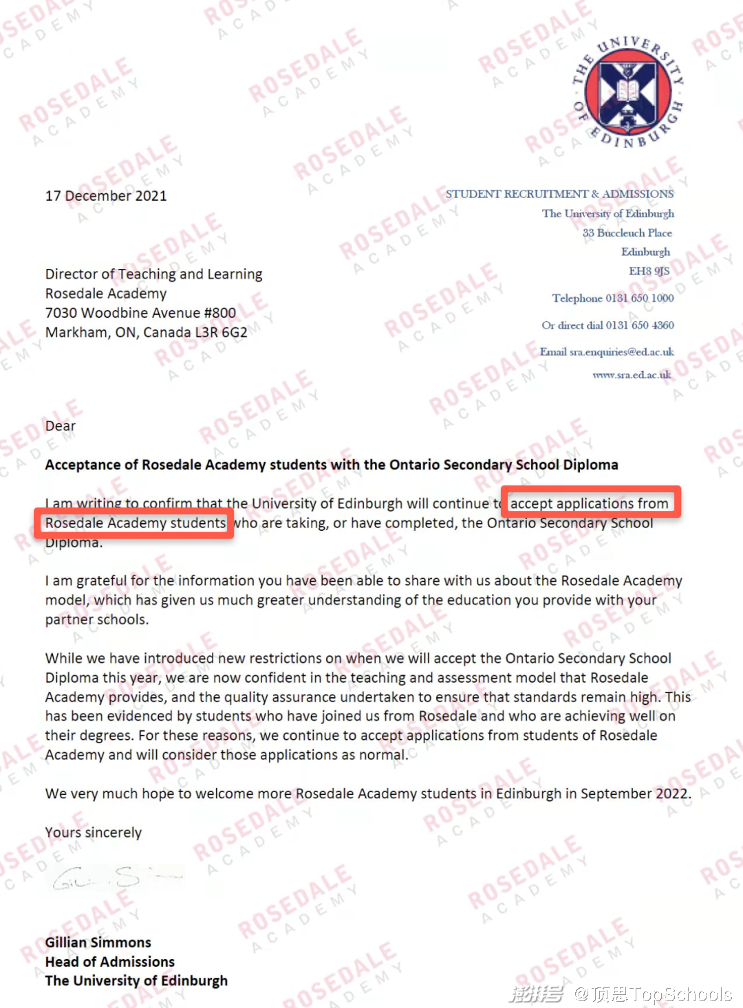 爱丁堡大学招生办主任 Gillian Simmons女士在给罗斯德的公函中写道: