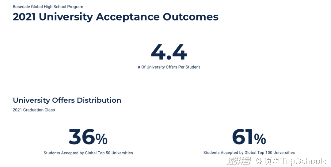 快速发展的全球学校网络,使罗斯德拥有比一般高中更具优势的世界顶尖大学录取数量和质量。2021年,罗斯德毕业生全球TOP100院校录取率61%,TOP50院校录取率36%,平均每人获得4.4封录取通知书,录取院校涵盖英国G5、香港六大名校、加拿大TOP3等世界顶尖名校。