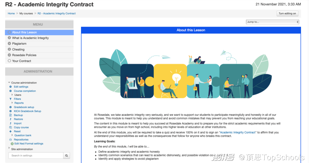 学生在开始学习课程前必须参加学术诚信必修课程,课程向学生阐述学术诚信的含义以及违反学术诚信可能产生的后果;