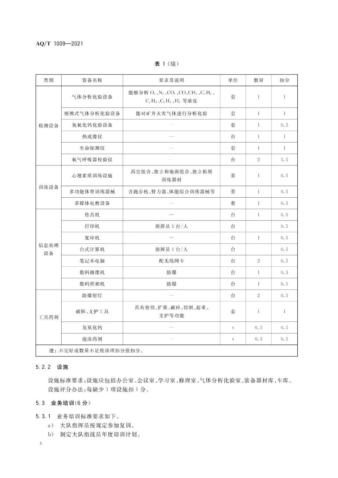 按照矿山救护队建制,矿山救护队标准化考核分为大队考核(含所属中队)和独立中队考核,考核采用每项单独扣分的方法计分,标准分扣完为止。考核满分100分,共分组织机构、技术装备与设施、业务培训、综合管理等5大项。