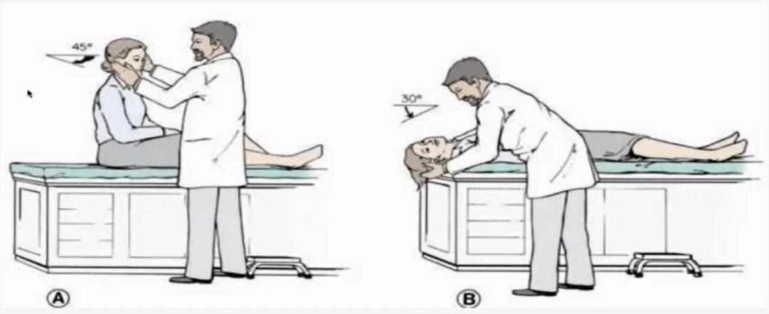 (3)BPPV不出现自发性眼震,水平半规管峭帽结石BPPV可能会在直视时的正中凝视眼位产生眼震,称为假性自发性眼震。将头部向前倾斜30°,眼震会消失,将头部进一步前倾时,出现眼震方向逆转,本质上是触发性眼震的另外一种形式。
