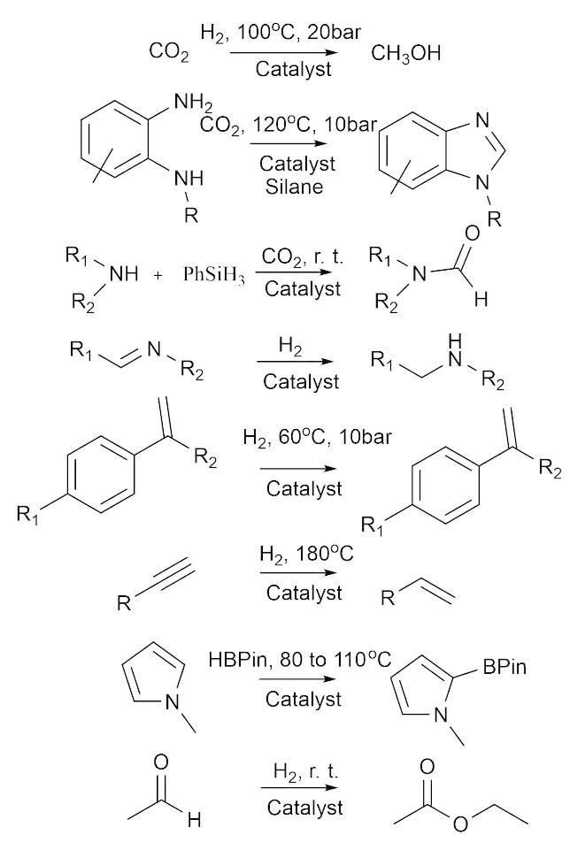 尽管目前仍然处于起始阶段,但多孔FLP作为催化剂被用于多种重要的反应体系。其中很多具有工业前景,例如CO2的转化,包含CO2加氢、CO2与胺加成等。实现催化剂不含金属或者不含贵金属元素进行常见原料的加氢反应,如烯烃/炔烃选择性加氢、亚胺加氢等(Fig. 4)。在不同体系中都取得了良好的效果,催化剂可多次循环使用。