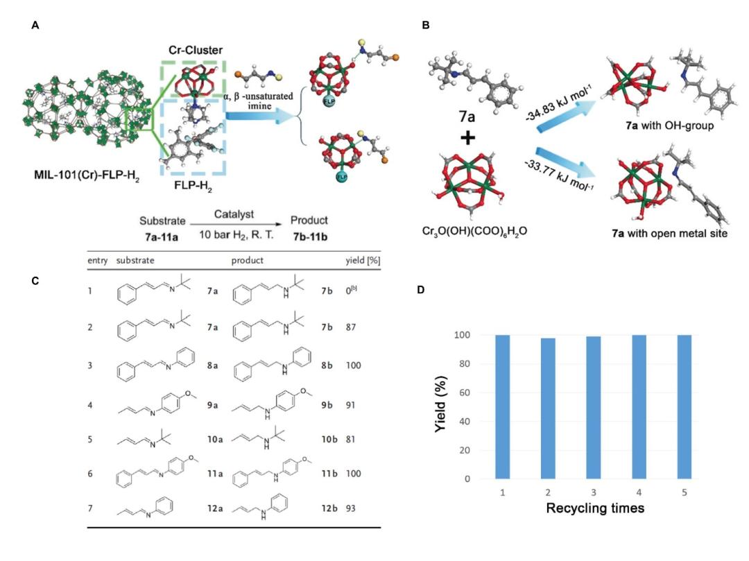 Figure 5. Selective hydrogenation of C=N bond with MIL-101(Cr)-FLP. Reproduced with permission from Ma et al. Copyright 2021 John Wiley and Sons. (Angew. Chem. Int. Ed. 58, 7420-7424.)