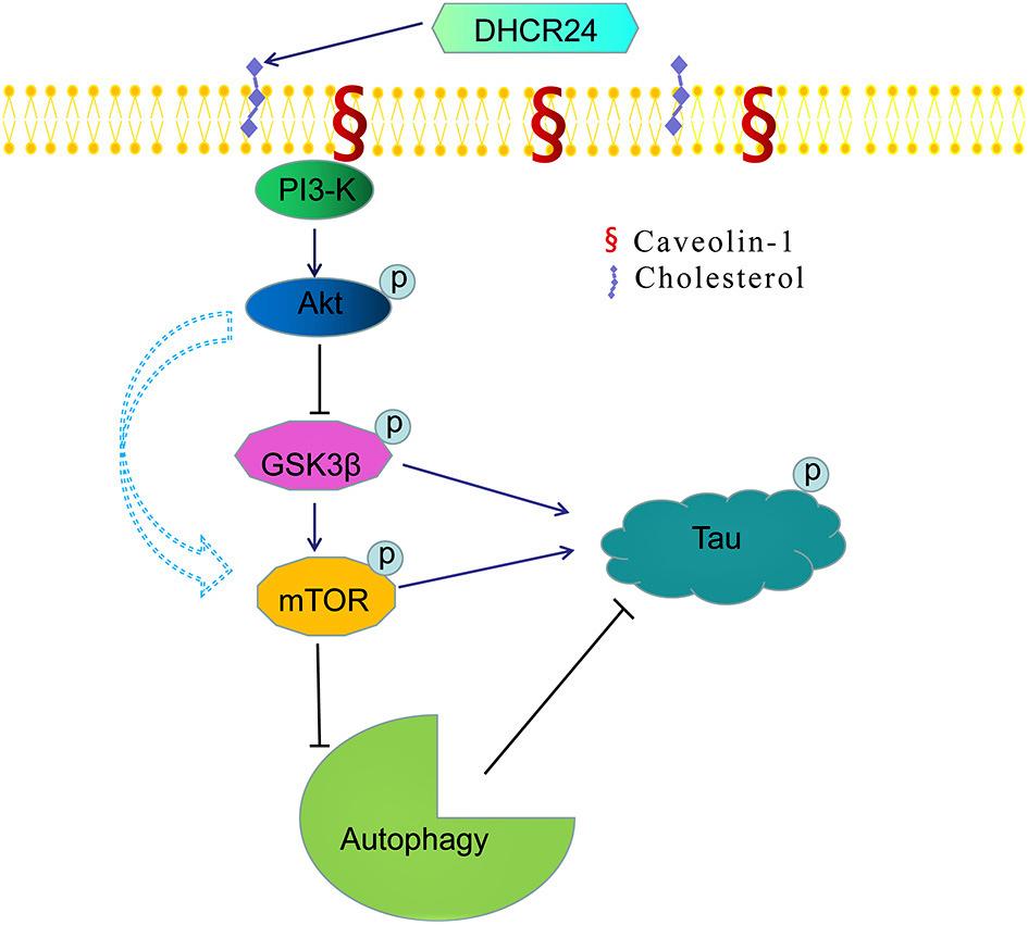 2021年3月12日,国际知名杂志神经化学研究Neurochemical Research(影响因子4.0)发表了复旦大学附属金山医院祖恒兵教授团队的最新研究成果“DHCR24 Knockdown Lead to Hyperphosphorylation of Tau at Thr181, Thr231, Ser262, Ser396, and Ser422 Sites by Membrane Lipid-Raft Dependent PP2A Signaling in SH-SY5Y Cells”。此外,2021年4月21日,国际权威杂志衰老神经科学前沿研究Frontiers in Aging Neuroscience(影响因子5.75)发表了该团队又一项最新研究成果“DHCR24 Knock-Down Induced Tau Hyperphosphorylation at Thr181, Ser199, Thr231, Ser262, Ser396 Epitopes and Inhibition of Autophagy by Overactivation of GSK3β/mTOR Signaling”。上述2项研究在国际上首次揭示了DHCR24通过调控细胞胆固醇代谢影响细胞膜胆固醇脂筏结构与膜信号活动,阐明了通过膜依赖性PP2A及GSK3β/mTOR两条重要信号通路影响细胞tau蛋白异常磷酸化的分子调节机制(见下图)。