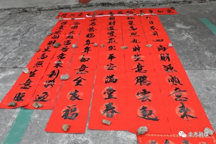 长垌乡群众正在晾干新写的春联。满载美好祝福的春联在书法家的笔下精心而成,“春风得意财源广、和气致祥家业兴”,“好运迎来四季福、新春送到八方财”等一副副寓意吉祥欢乐的春联挂满现场,洋溢着春节的喜庆氛围。当天,在欢声笑语中共书写春联100多副,赠送给当地村民,表达新春的美好祝福。
