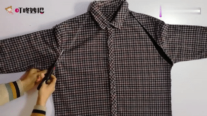 第一步:衬衫的左右两侧剪开,一直剪到袖窝处;两条袖子也剪开。