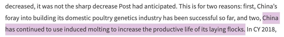 美国农业部:2016-2017年中国的家禽业通过人工强制换羽延长了蛋鸡的使用寿命。截图来源:www.fas.usda.gov/data/china-poultry-and-products-annual-2在新冠疫情期间,强制换羽也减少了我国养殖户的损失。2020年3月新华每日电讯报道,因为疫情影响物流,饲料没有办法运到养鸡场,不少蛋鸡养鸡户被迫给蛋鸡实施强制换羽,使其进入类似暂时“休眠”的状态,从而在节约饲料的同时避免死亡。