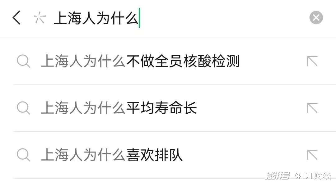 打开微信搜索框输入“上海人为什么”,自动联想的第三个问题就是“上海人为什么喜欢排队”。