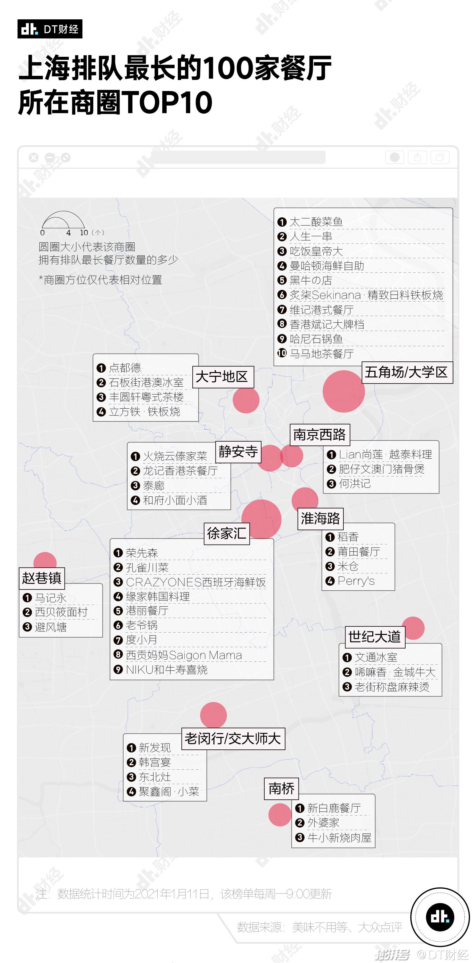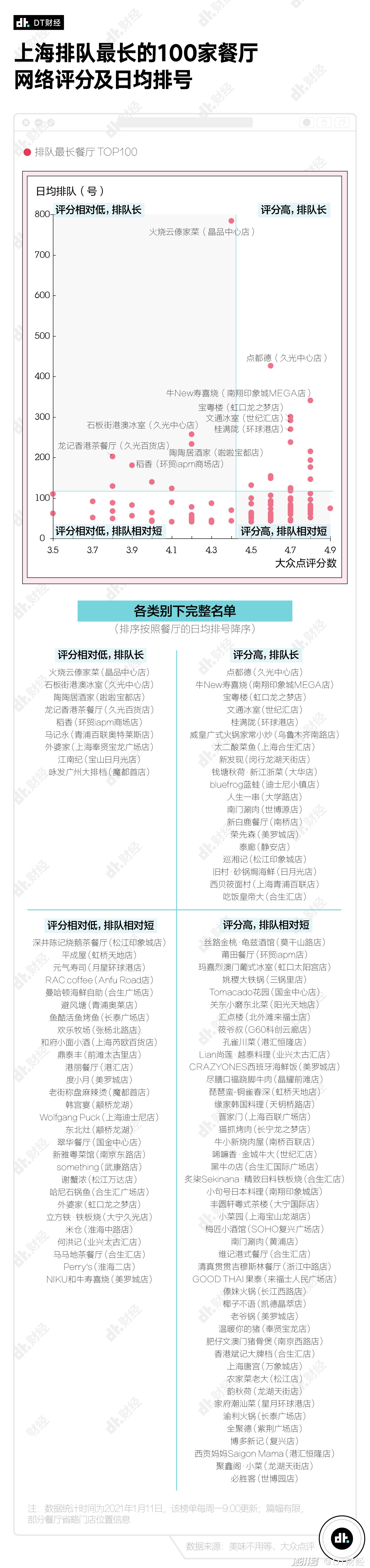 为了给大家的精准打卡活动(或是避开计划)一些参考,我们找到了上海日均排队最长的100家餐厅,尝试回答以下问题: