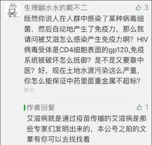 造谣文章提到所有疫苗都是有害的,如果家长为自己孩子着想,就不能给孩子注射任何疫苗,否则轻则各种疾病多发,重则残疾失去生命。文章一出,评论里就有不少支持者,甚至建了一个群分享经验,拒绝一切疫苗,还有人表示艾滋病(HIV)都是医生发明出来的……